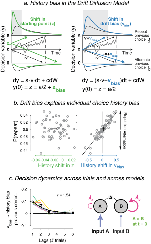 People’s individual tendency to repeat or alternate their own choices was captured by a change in their history-dependent drift bias (Figure b). Not only was this main finding present regardless of whether the previous choice was correct or not, we also found that the effect of choice history lasts multiple trials into the past (Figure c, left). We then fit a set of more complex models to the data, showing that choice history bias most likely arises from unbalanced input (think of the stimulus-selective neuronal responses in sensory cortex) to the accumulators that govern behavioral choice (Figure c, right). This is intriguingly similar to the mechanisms by which our visual system can selectively pay attention to only some parts of an image, depending on