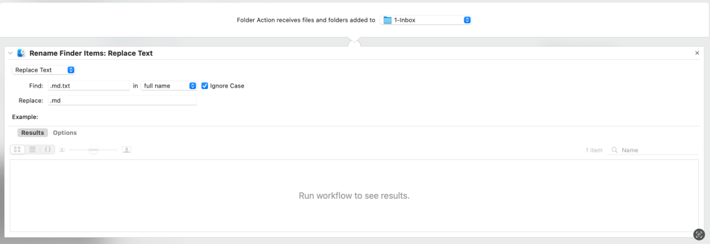 .txtextension to the file you’ve just created (which is not recognized by Obsidian). On Mac, we can build an automator workflow: it will monitor the Inbox folder for files called .md.txt, and remove the .txt extension.