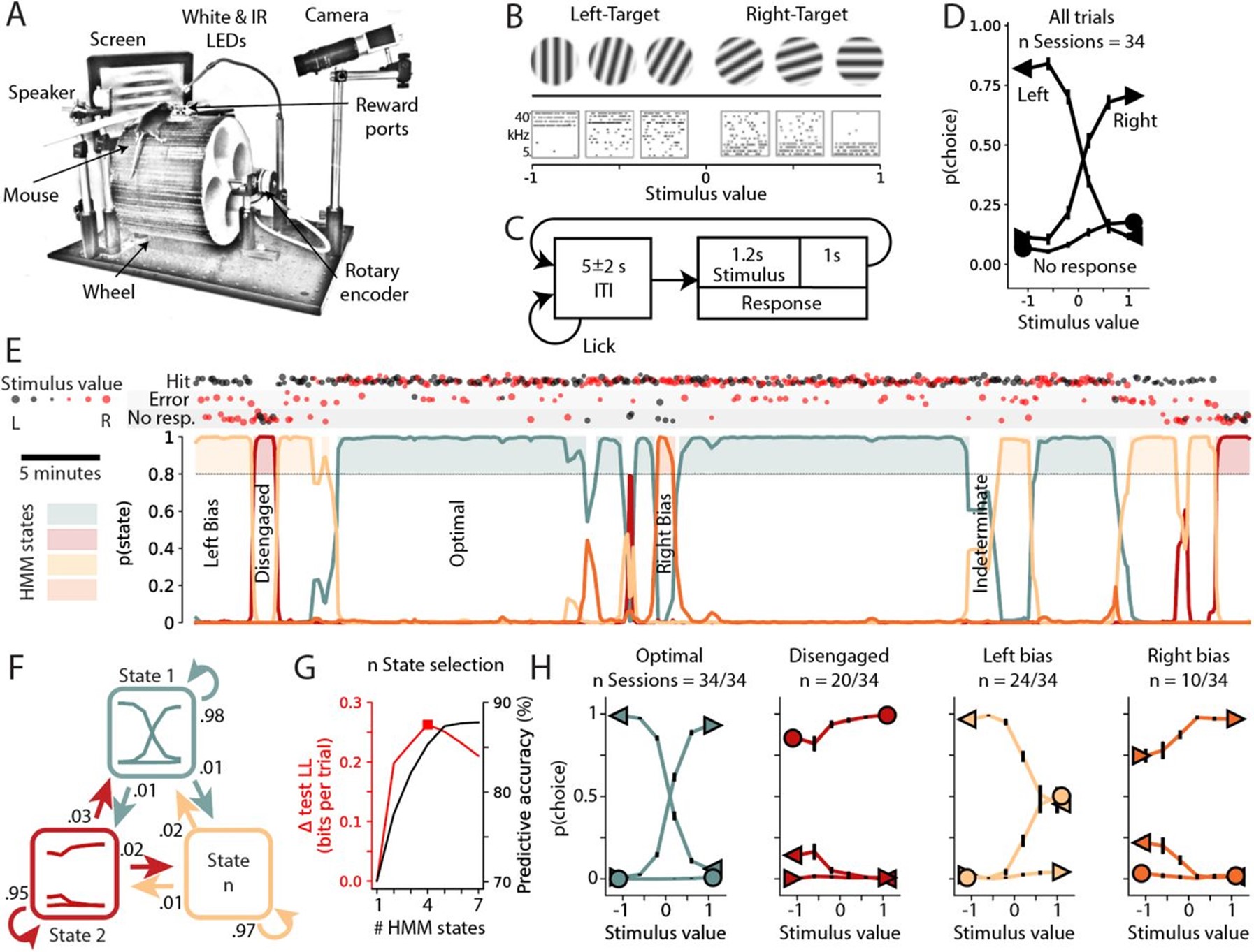 A previous paper by Ashwood et al. (2022) found that mice performing a perceptual decision making task employ a variety of different strategies over the course of testing sessions. These strategies were described by a Hidden Markov Model (HMM), in which a set of unobservable, discrete states with Markov property are inferred based on observable behaviour. Each state, or behavioural strategy, is characterised by a sigmoidal mapping between stimulus features (current stimulus, previous error/correct, previous choice and a bias term) and response (left or right; i.e., a state-specific generalised linear model). In the present paper, Hulsey and co-authors investigate whether these state switches are related to fluctuations in arousal, measured by pupil dilation, face movement and locomotion in an auditory and a visual stimulus discrimination task. Mice reported whether a Gabor was closer to a vertical or horizontal orientation, or whether an auditory tone cloud was in a higher or lower octave. They completed this task in conditions which facilitated large fluctuations in arousal, as they could run on a wheel as desired, but there were long (3-7s) inter-trial intervals.